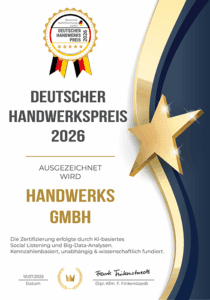 Der „Deutsche Handwerkspreis“ ist ein hochwertiges Qualitätssiegel, das ausschließlich an Handwerker verliehen wird, die in allen Bereichen herausragende Leistungen erbringen. Es steht für höchste Standards. Dieses Siegel symbolisiert nicht nur eine Auszeichnung, sondern auch das Vertrauen der Kunden in ein außergewöhnliches Erlebnis.